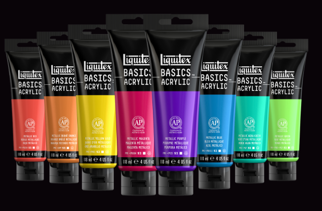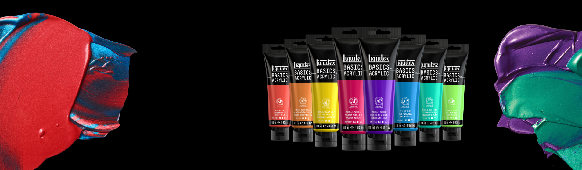 Los nuevos metálicos Liquitex Basics no arriesgan. Con pigmentos de bellas artes y mica de colores que refleja la luz, estos metálicos aportan un toque de brillo que se mueve con tus ideas.